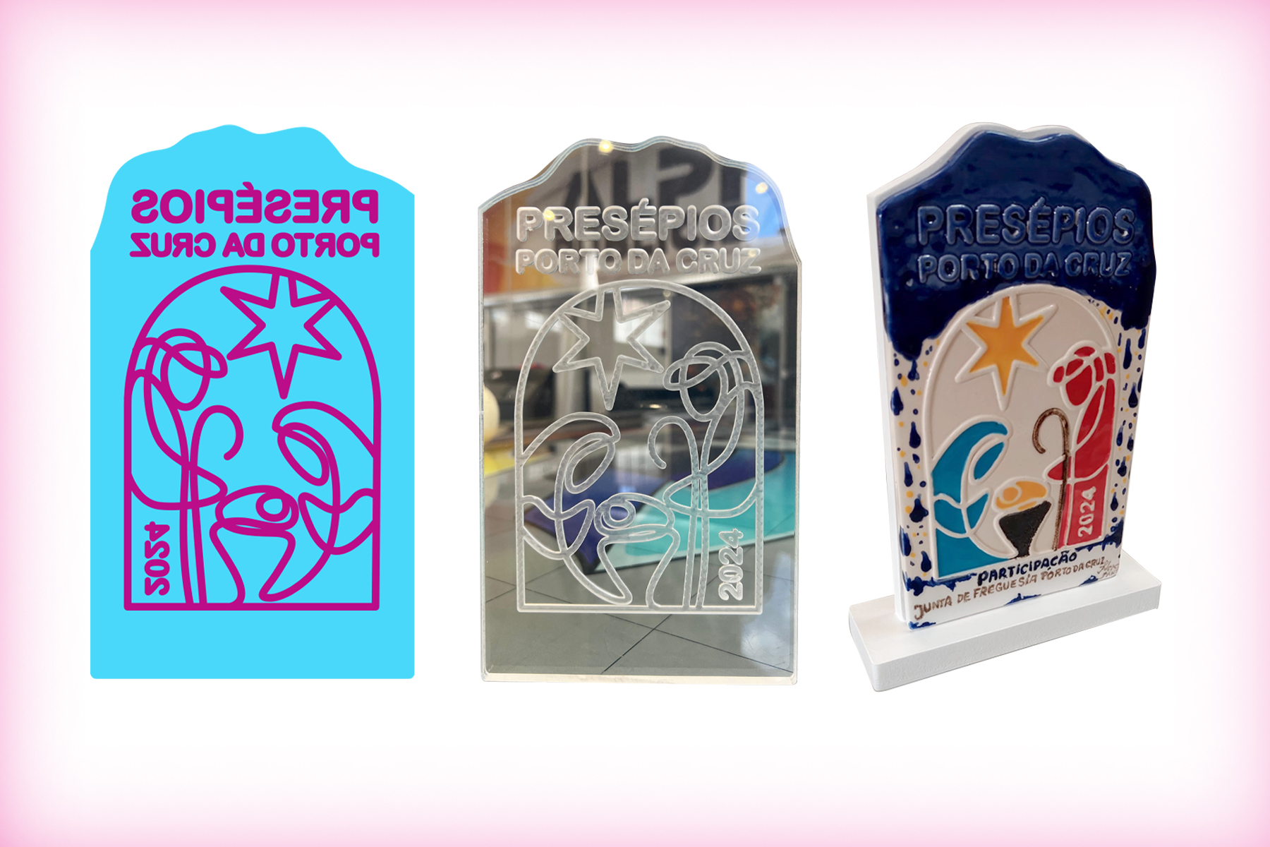 Cliente: freguesia do Porto da Cruz Criação de troféus para os melhores presépios da freguesia do Porto da Cruz. Imagem, moldes em acrílico e finalmente aplicação em cerâmica. Um trabalho em colaboração com o artista Renato Nóbrega. Suportes: Acrílico e Cerâmica